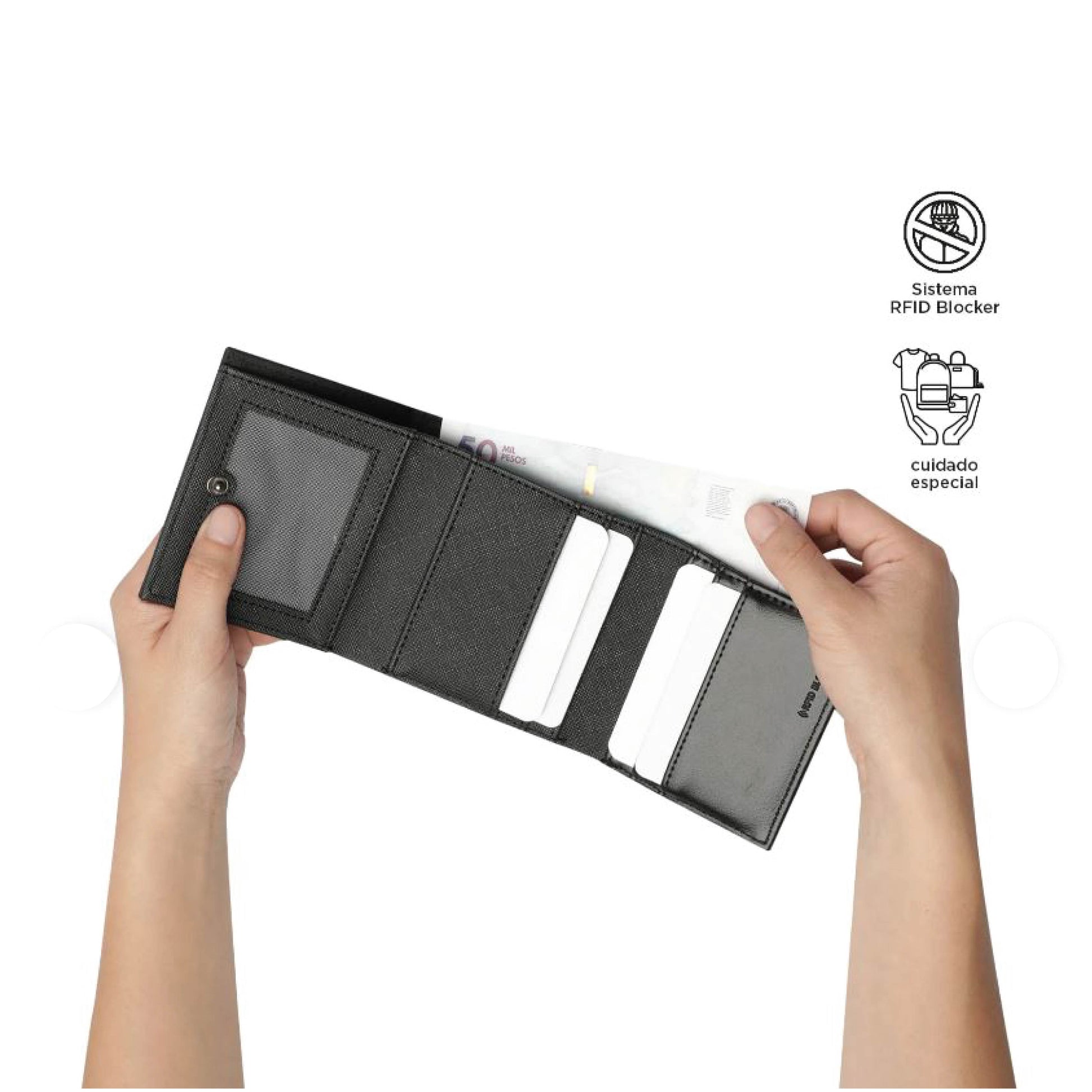 Su diseño de tres cuerpos (trifold) incluye organizadores para tarjetas, compartimento para billetes y bolsillo interno en malla para pequeños objetos. El cierre en broche garantiza seguridad adicional, mientras que su sistema RFID Blocker protege la información de tus documentos frente al robo digital. Fabricada en material ligero y resistente tipo Saffiano, es práctica, elegante y fácil de cuidar.